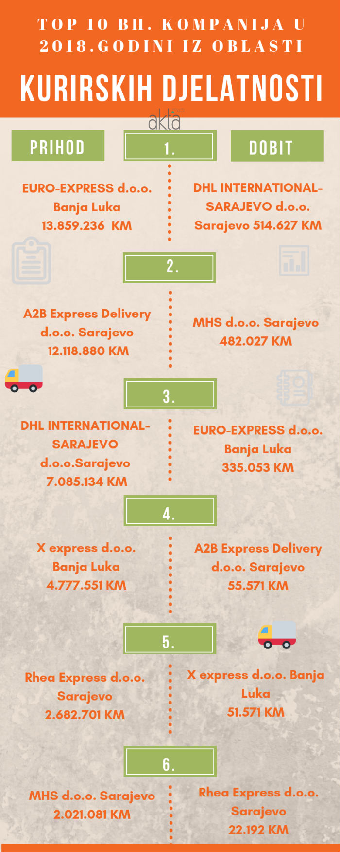 TOP deset kurirskih kompanija u BiH u protekloj godini – Poslovni portal Akta.ba donosi analizu poslovanja za TOP 10 kompanija u Bosni i Hercegovini koje se primarno bave pružanjem kurirskih usluga.