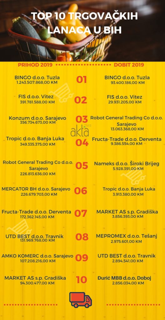 TOP deset trgovačkih lanaca BiH po ostvarenom prihodu i dobiti u 2019. – Poslovni portal Akta.ba i ove godine, a na osnovu finansijskih pokazatelja kompanija, donosi analizu TOP 10 trgovačkih lanaca u Bosni i Hercegovini po najbolje ostvarenoj dobiti i prihodima.