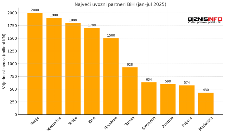 S druge strane, najviše robe u sedam mjeseci smo uvezli iz Italije – oko 2 milijarde KM. Slijede Njemačka, Srbija, Kina i Hrvatska.