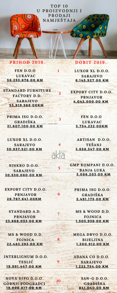 TOP deset u proizvodnji i prodaji namještaja za 2019. – Poslovni portal Akta.ba je uradio analizu top 10 kompanija u Bosni i Hercegovini čija je djelatnost proizvodnja i prodaja namještaja od drveta i metala za domove, poslovne i prodajne prostore.