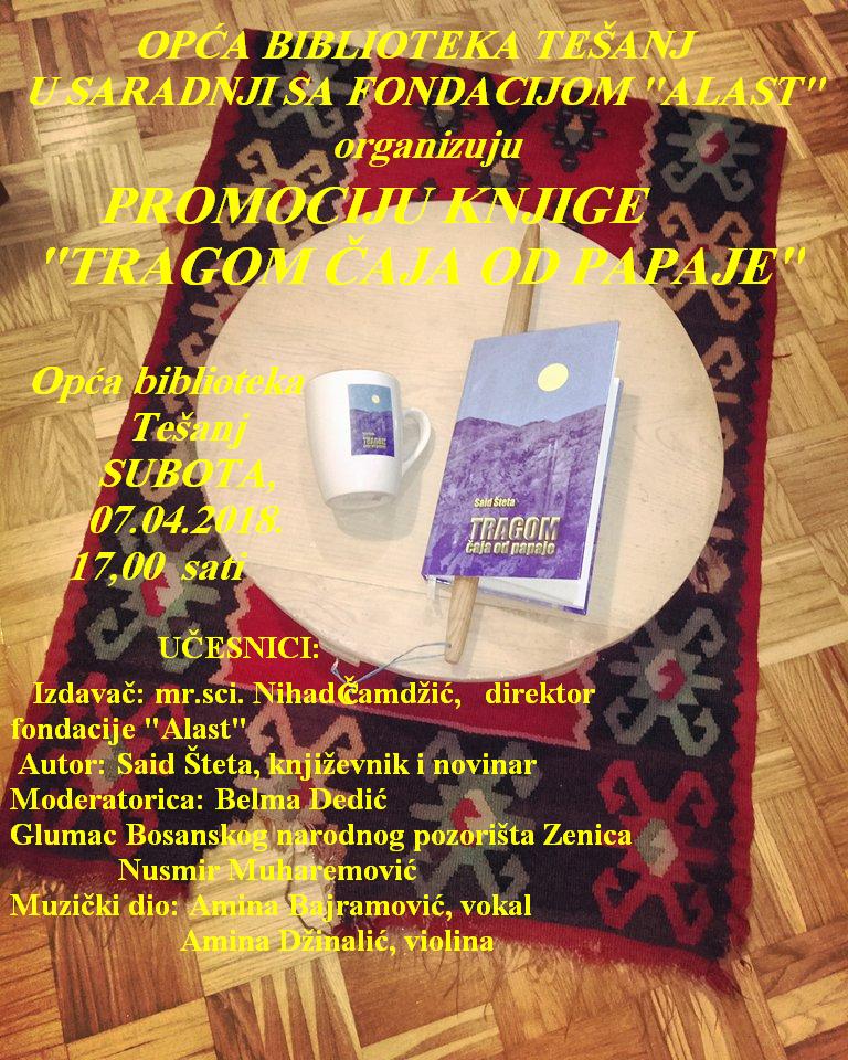 „Tragom čaja od papaje“ u Tešnju – Kada bi se emocije mogle točiti kao svjetski poznata tešanjska voda, onda bi Opća biblioteka Tešanj u to subotnje večer 7.aprila, bila njihovo najveće izvorište. Brojni posjetioci uz promotore, učinili su ovaj prostor posebnim, a večer u bublioteci za pamćenje.