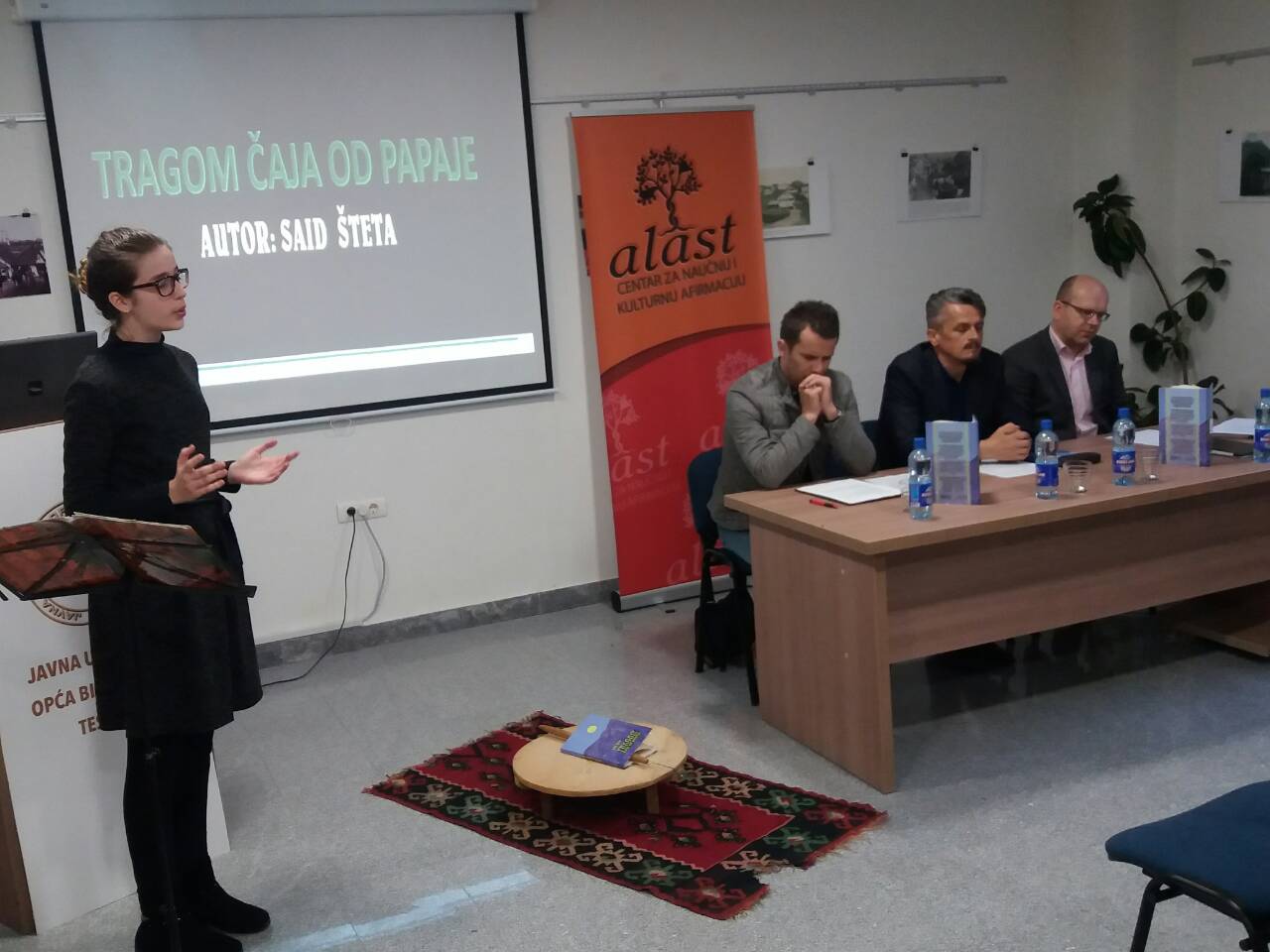 Svojim najavnim obraćanjem direktorica biblioteke mr.sci. Almina Brkić, samo je prisutnim dušama podigla branu osjećanja da poteku, iskreno i ljudski. Nakon pjesme „Što te nema“ mlade vokalne solistice Amine Bajramović iz Zenice, i odlomka iz naslovne priče „Tragom čaja od papaje“ kojeg je recitovao izvrsni glumac BNP Zenica, Nusmir Muharemović, emocije su u potpunosti ispunile ovaj predivni prostor. Nakon ovog u staroj bosanskoj nošnji ušla je moderatorica Belma Dedić mameći uzdahe, čitajući dio iz predgovora knjige, a potom predstavljajući učesnike promocije.