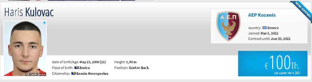 Haris Kulovac, dvadesetjednogodišnjak iz Zenice, ove polusezone je napustio nogometnog prvoligaša iz Gračanice, ekipu Bratstva. Ovaj štoper u dresu Bratstva nastupio je 26 puta i postigao 2 gola. Seniorsku karijeru započeo je u ekipi Žepča, dok je u mlađim uzrastima bio član Čelika iz Zenice, a još je u BiH igrao za TOŠK iz Tešnja i Natron iz Maglaja.