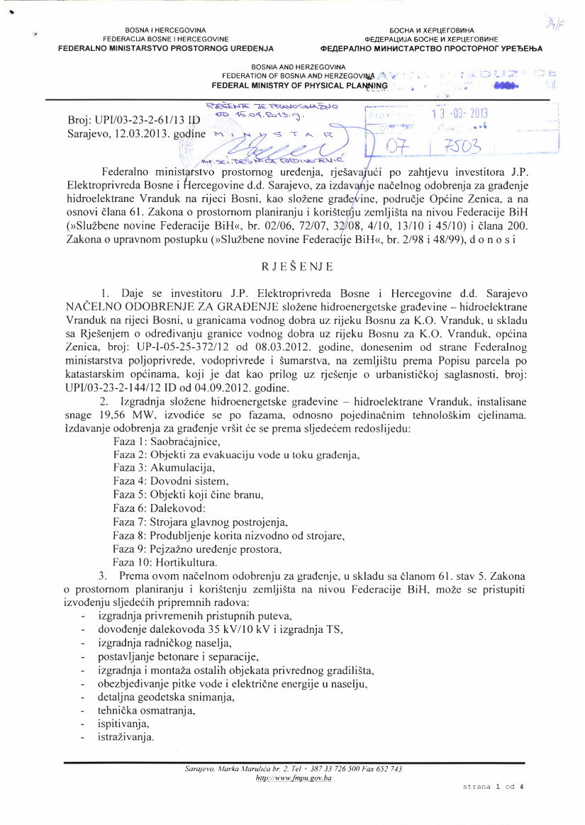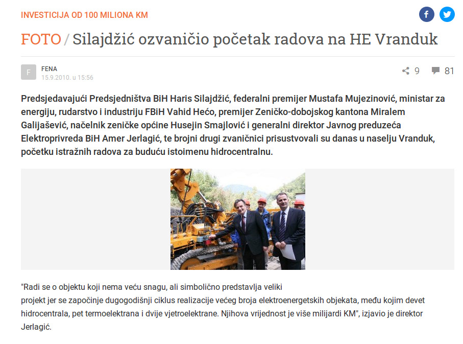 “U četvrtak u 11 sati bit će upriličeno svečano otvorenje gradilišta HE Vranduk, čime će zvanično početi radovi na izgradnji prve hidroelektrane u sistemu JP Elektroprivreda BiH u poslijeratnom periodu,” glasila je najava iz Elektroprivrede BiH.