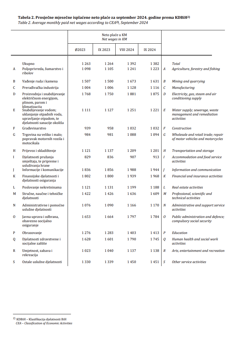 Prosječna mjesečna isplaćena neto plaća po zaposlenome u pravnim osobama u BiH za septembar 2024. godine iznosila je 1 382 KM, što pokazuje nominalani pad za 0,7 posto, i realno je manji za 0,8 posto u odnosu na august 2024. godine.