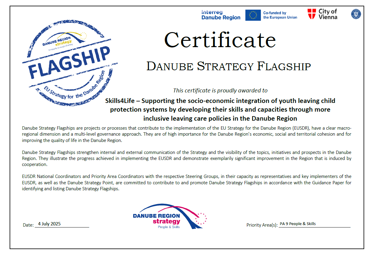 Ovaj prestižni certifikat dobio je projekat Skills4Life u kojem učestvuje 12 partnera iz 9 zemalja Dunavske regije, a projekat ima za cilj da podrži socijalnu i ekonomsku integraciju mladih koji napuštaju sisteme dječije zaštite, kroz razvoj njihovih vještina i kapaciteta, te unapređenje inkluzivnih politika podrške u dunavskoj regiji.