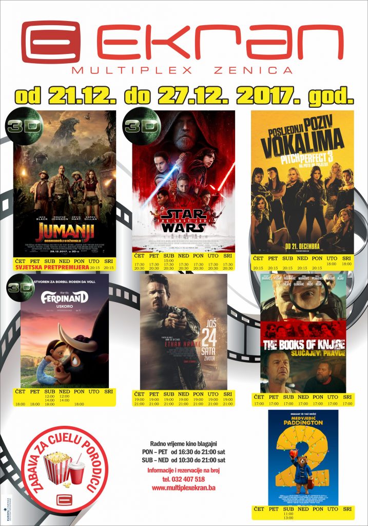 Tri nova filma u kinu: “Pitch perfect 3: Na putu do zvijezda”, “Ferdinand 3D” i “Jumanji: Dobrodošli u džunglu (3D)” – Od 21. decembra na redovnom programu Multiplexa Ekran željno očekivani nastavak muzičke komedije “PITCH PERFECT 3: NA PUTU DO ZVIJEZDA”, animirana 3D komedija “FERDINAND (3D)” i pretpremijerne projekcije akcione avature “JUMANJI: DOBRODOŠLI U DŽUNGLU (3D)”