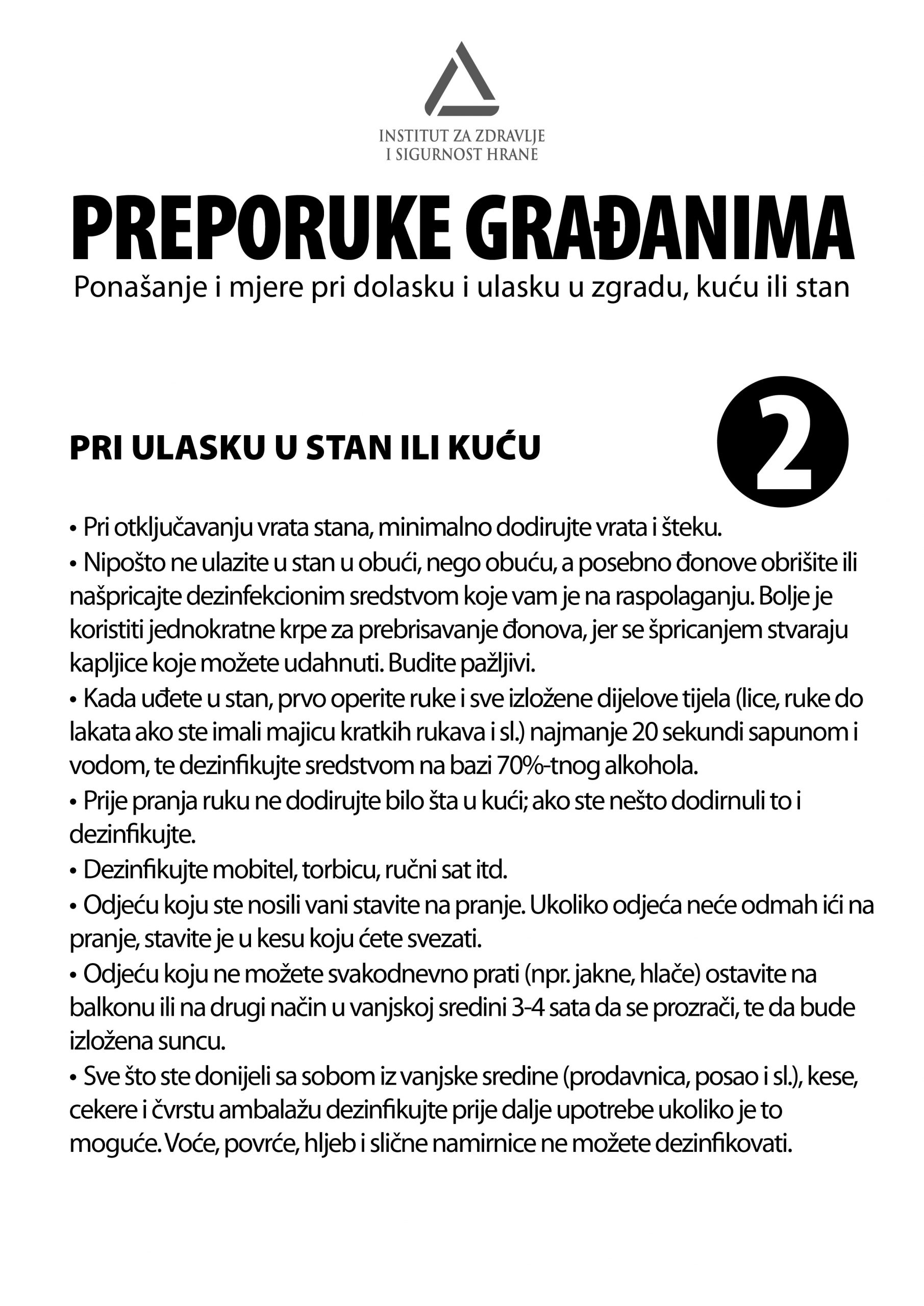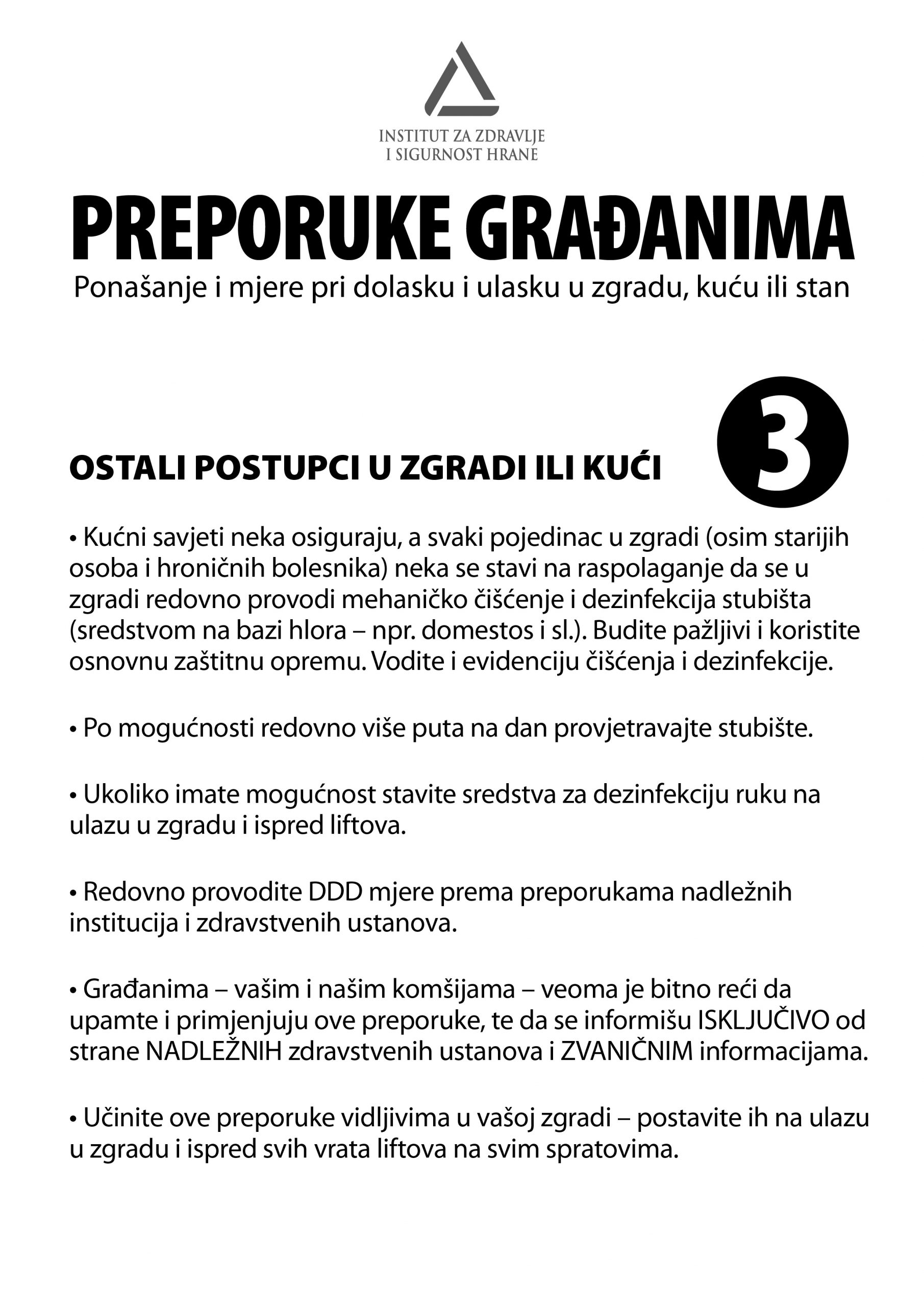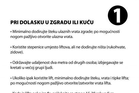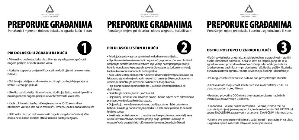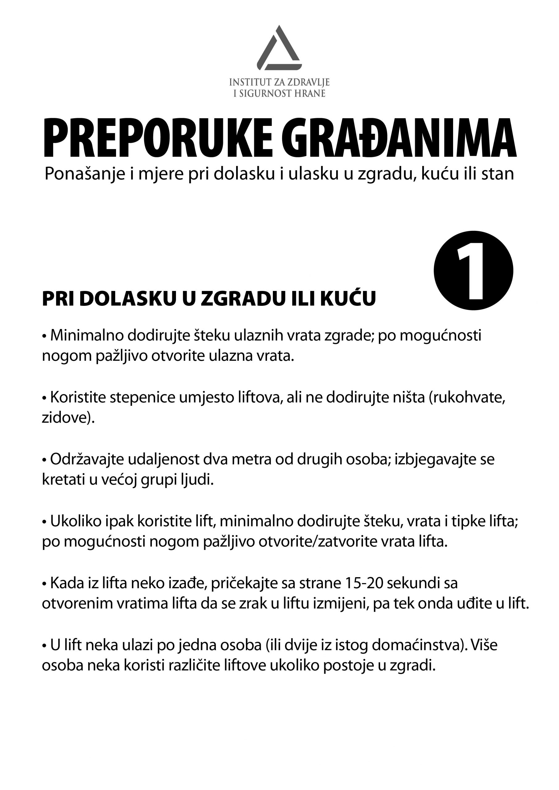Prema svim građanima u polju djelovanja Institut za zdravlje i sigurnost hrane Zenica je preko gradskih i općinskih uprava, Službi za stambene i komunalne poslove, društvene djelatnosti, te sličnih nadležnih službi proteklih dana upućen set preporuka građanima za postupke pri dolasku i ulasku u zgradu ili kuću.
