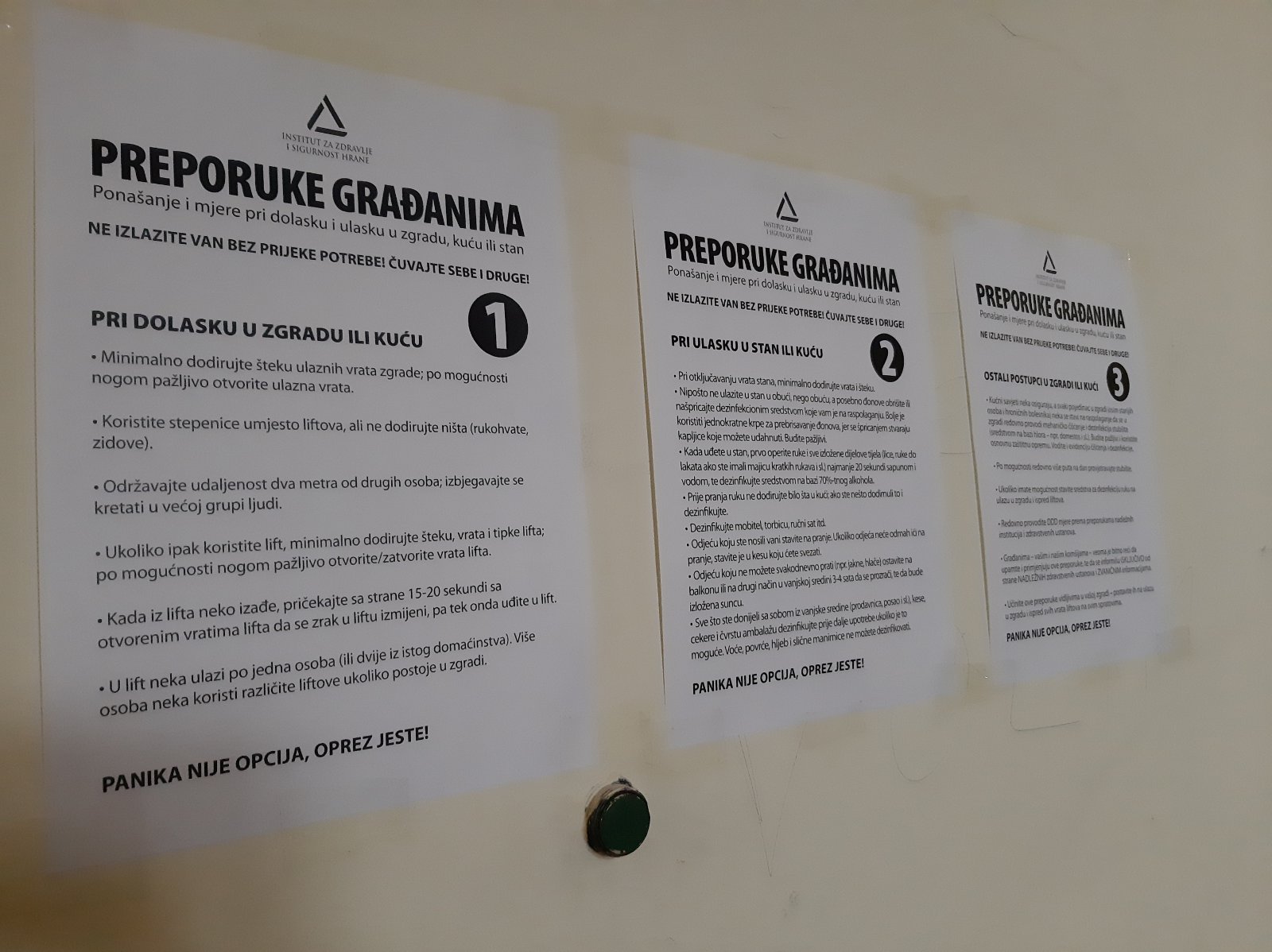 Učinite ove preporuke vidljivima u vašoj zgradi – postavite ih na ulazu u zgradu i ispred svih vrata liftova na svim spratovima. Panika nije opcija, oprez jeste, poručuju iz INZ-a.