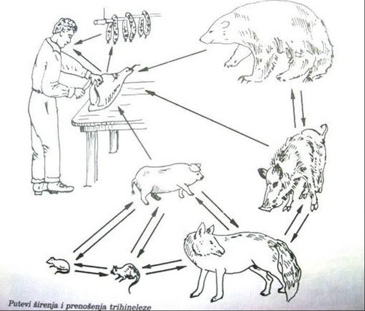 Trihineloza je primarno infekcija divljih životinja (lisica, vuk, medvjed, divlja svinja, jazavac, razne vrste glodara) u čijem se krugu (silvatični krug) ova infekcija stalno održava. Od divljih životinja infekcija se prenosi na pacove, stvarajući nova žarišta. Među pacovima ova infekcija se stalno održava i povremeno se prenosi na domaće svinje, ali i na domaće mačke i pse, a postoje podaci da se nalazi i u kokoškama. Međutim za čovjeka je najčešći izvor infekcije meso svinja.