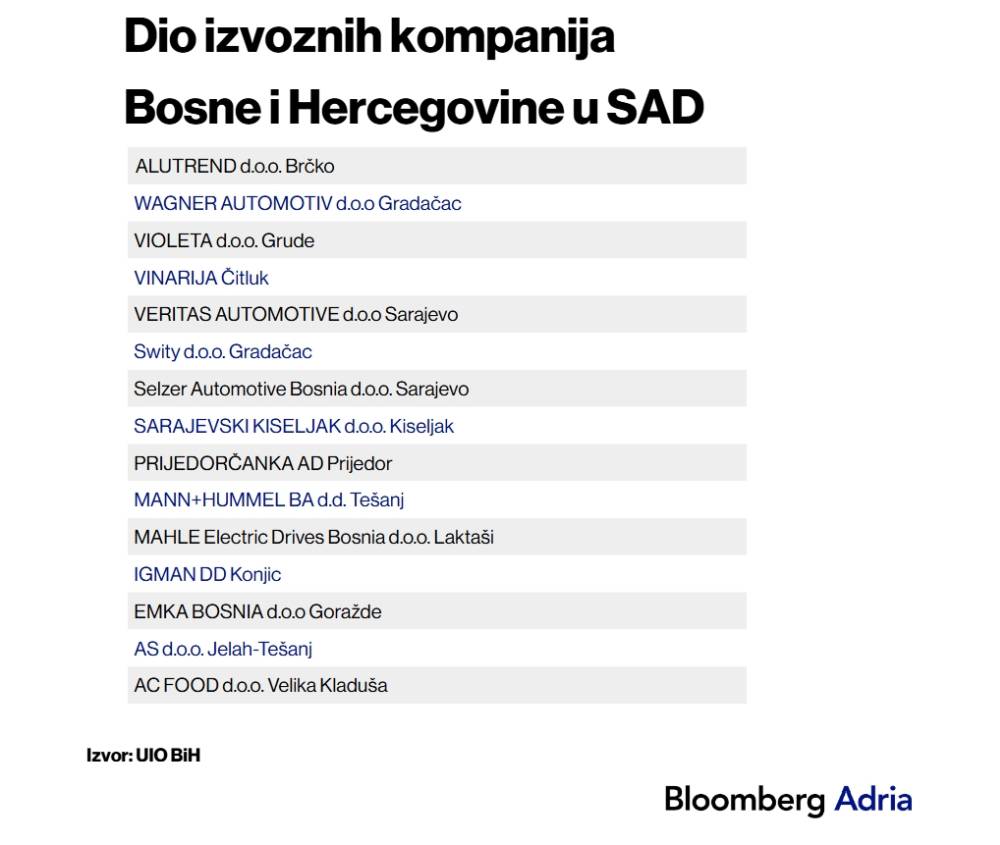 Podaci Uprave pokazuju da više od 100 bh. firmi direktno i svoje proizvode plasira na tržište SAD-a. U nastavku su samo neke od njih na koje će ovakve carinske mjere sigurno imati utjecaj.