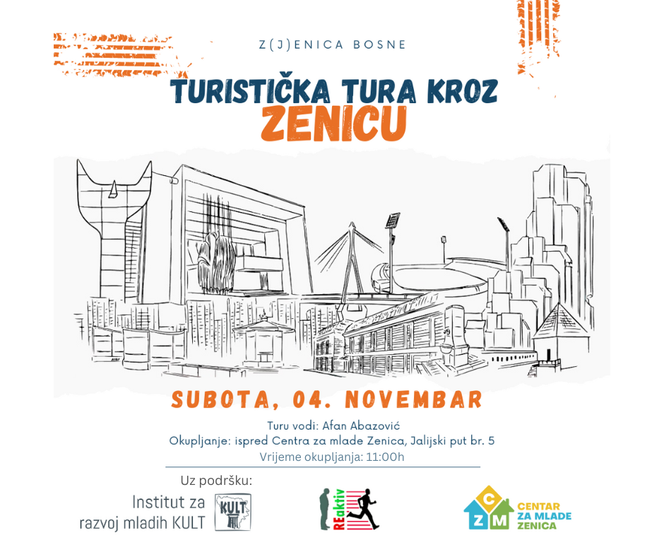 S radošću pozivamo sve Zeničane i Zeničanke da nam se pridruže na turističkoj turi kroz naš grad, koja će se održati u subotu, 04.11.2023.g., sa mjestom okupljanja kod Centra za mlade Zenica, na adresi Jalijski put broj 5, u 11:00h.