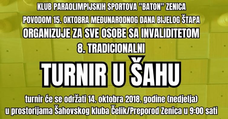 Turnir u šahu povodom dana slijepih osoba – Udruženje gradana Klub paraolimpijskih sportova „BATON“ Zenica, povodom 15. oktobra međunarodnog dana bijelog štapa/ dana slijepih osoba, tradicionalno već devetu godinu zaredom organizuje TURNIR U ŠAHU ZA OSOBE SA INVALIDITETOM.