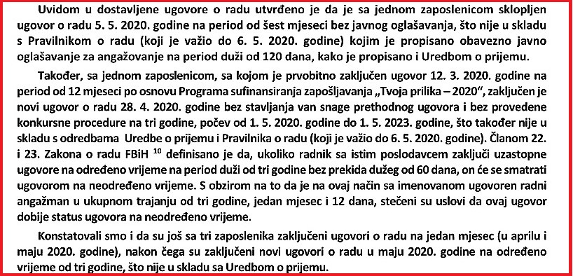 Žurnal je već pisao kako su prošle godine bivši v.d. direktor Zavod zdravstvenog osiguranja Zeničko-dobojskog kantona Dževad Hamzić optužen i potom prvostepeno, dakle još nepravomoćno, osuđen na devet mjeseci zatvora zbog zapošljavanja jedne osobe na period od dva mjeseca. Bivša direktorica iste institucije Mirzeta Subašić je zbog zaključivanja ugovora o radu do ispunjenja tri godine, odnosno do stalnog zaposlenja sa jednom osobom, nepravomoćno osuđena na tri godine i šest mjeseci zatvorske kazne.