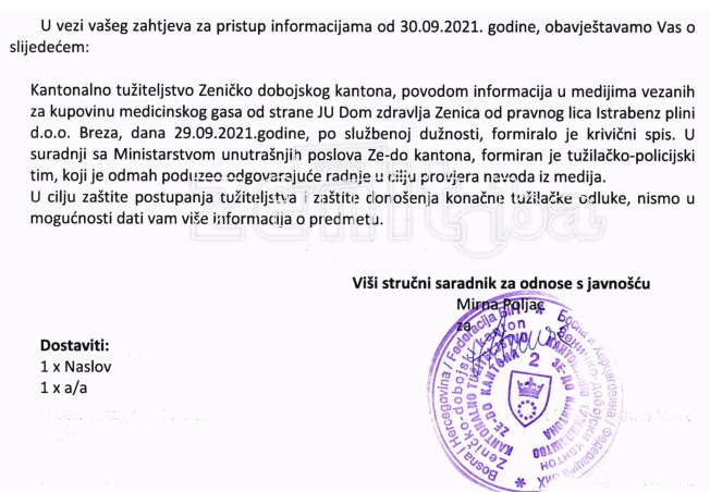 Na osnovu medijskih natpisa početkom ove sedmice, a vezano za nabavku kisika u JU “Dom zdravlje” Zenica i saznanja medija da se isti nabavlja od firme “Istrabenz plini” d.o.o. Breza, koja prema istim tim navodima nema potrebne dozvole za takvu djelatnost, kontaktirali smo Tužilaštvo ZDK kako bismo provjerili da li su pokrenute određene aktivnosti na provjeri ovih navoda.