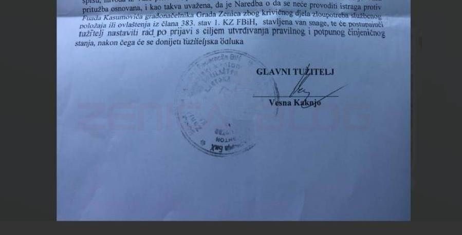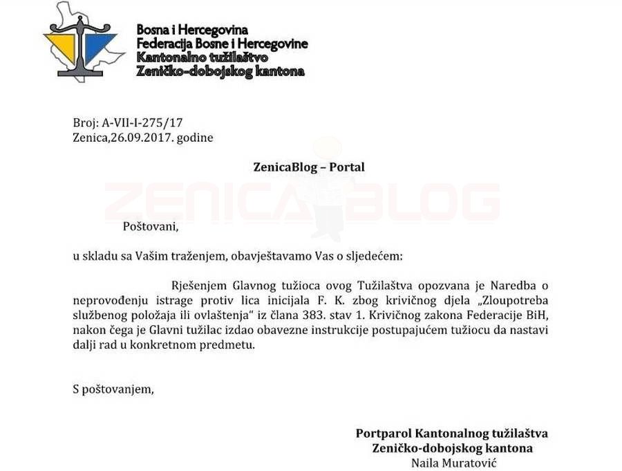 Podsjećamo, prvobitno je “utvrđeno da je u predmetu po podnesenoj prijavi protiv F.K., gradonačelnika Zenice, donesena Naredba o nesprovođenju istrage, jer nema osnova sumnje da je prijavljena osoba počinila krivično djelo ‘Zloupotreba položaja ili ovlašćenja’ iz člana 383. stav 1. Krivičnog zakona Federacije BiH”.
