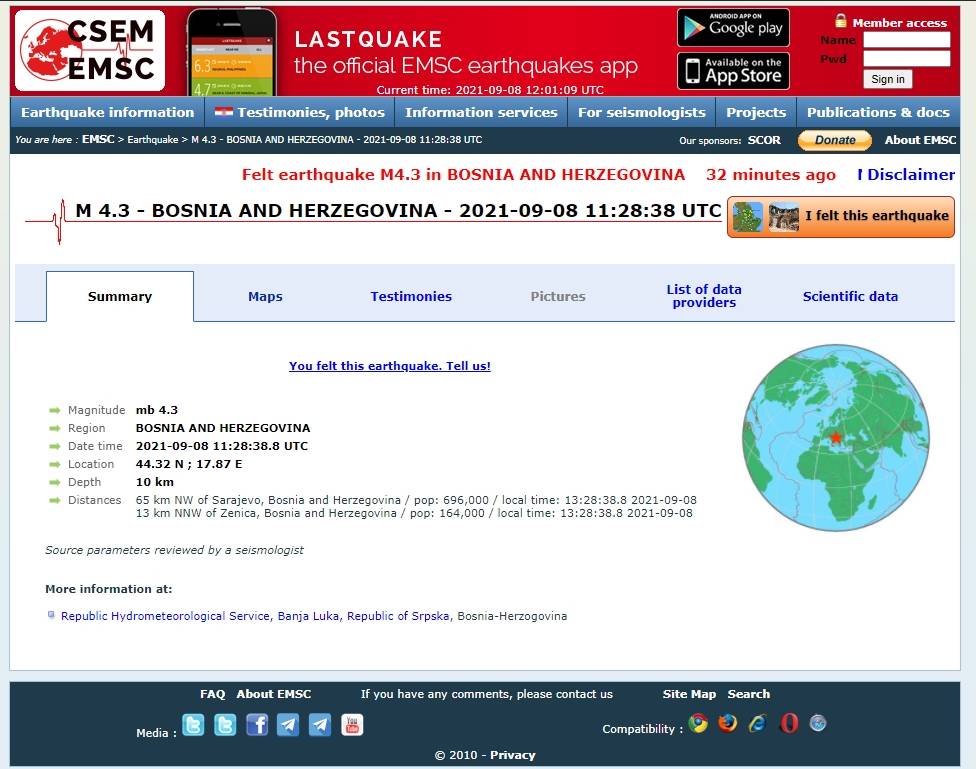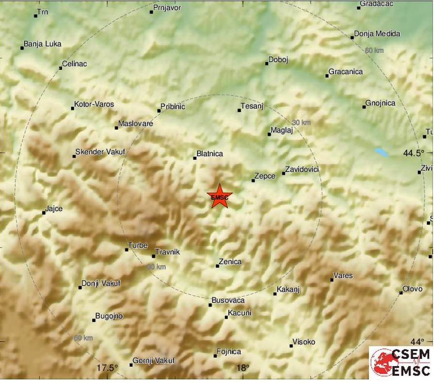 U 13.28 na području Zenice osjetio se zemljotres. Prema EMSC-u, zemljotres je zabilježen 13 kilometara sjeverno-sjeverozapadno od Zenice – na dubini od deset kilometra, magnitude 4,3 – epicentar po EMSC se nalazio između Nemile i Orahovice.-