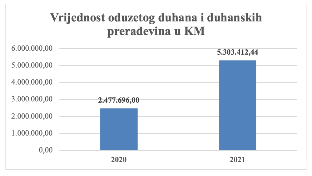 Shodno Operativnom programu rada UIO za 2021. godinu, grupe za sprječavanje krijumčarenja i prekršaja poseban akcenat dale su aktivnostima na suzbijanju nelegalnog prometa duvana i duvanskih proizvoda,gdje su ostvareni najznačajniji rezultati u dosadašnjem radu. U 2021. godini izvršeno je privremeno oduzimanje ovih vrsta roba (cigareta, rezanog duhana, ručno punjenih cigareta, arome za nargilu, duhana u listu) u ukupnoj vrijednosti od 5.303.412 KM, što je u odnosu na 2020. godinu, kada je oduzeto 2.477.696 KM, više za 2.825.716 KM, odnosno, procentualno čak više za 114,05%, o čemu se daje slijedeći tabelarni i grafički prikaz:
