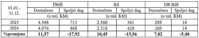 U tablici ispod dajemo prikaz ukupno raspoređenih sredstava entitetima i Distriktu Brčko BiH sa pripadajućim spoljnim dugom u periodu januar-decembar 2025. godine u poređenju sa istim periodom prošle godine. Svi iznosi su iskazani u milionima KM.