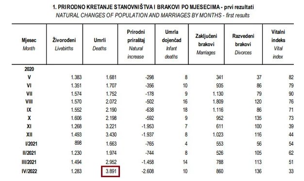 Poređenja radi, u januaru prošle godine, prije početka pandemije, umrle su ukupno 1.354 osobe, a u aprilu je taj broj porastao na 1.928 pojavom prvog talasa epidemije u proljeće prošle godine.