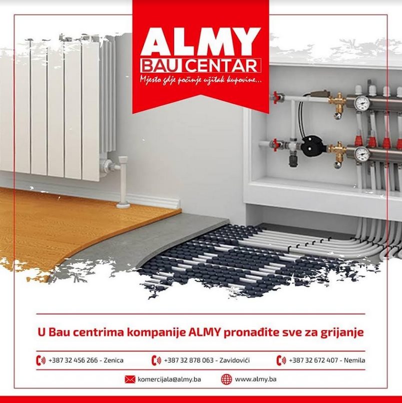 Cijenjeni kupci kompanije Almy, u našim Bau centrima pronađite kompletan program grijanja: kotlove, peći, ventile, razdjelnike, cijevi, mjerne instrumente, ekspanzione posude, opremu za podno grijanje i još mnogo toga.