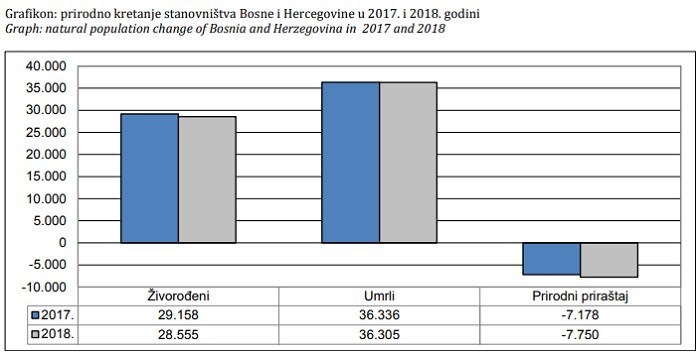 Prošle godine je umrlo 36.305 lica, što u odnosu na 2017. godinu pokazuje pad broja umrlih za 0,09%. Prirodni priraštaj prošle godine bio je negativan za 7.750, a godinu ranije za 7.178.
