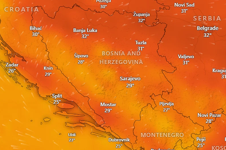Temperature zraka u 11 sati su iznosile: Bjelašnica 10 stepeni, Ivan Sedlo i Sokolac 20, Bugojno, Livno i Zenica 22, Neum i Srebrenica 23, Sarajevo i Široki Brijeg 24, Drvar, Sanski Most i Tuzla 25, Banja Luka, Bihać i Doboj 26, Bijeljina, Gradačac, Mostar i Trebinje 27 stepeni.