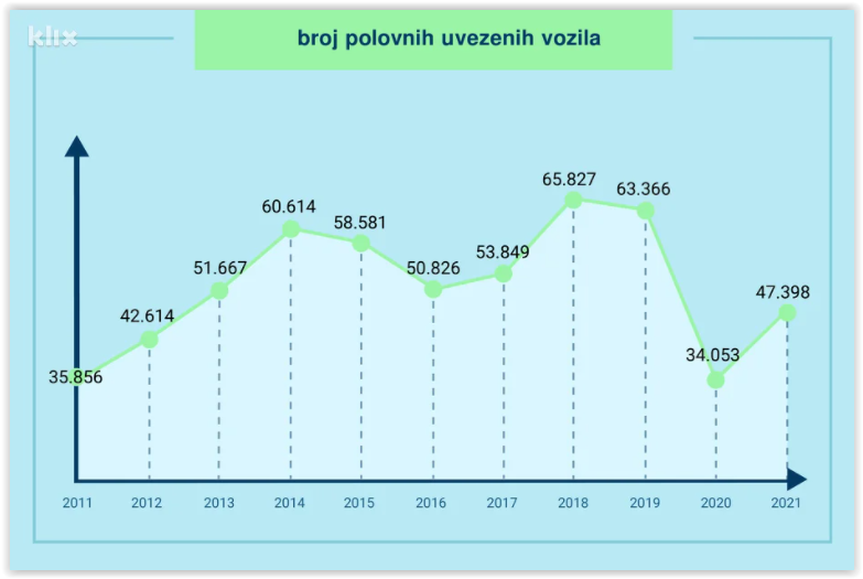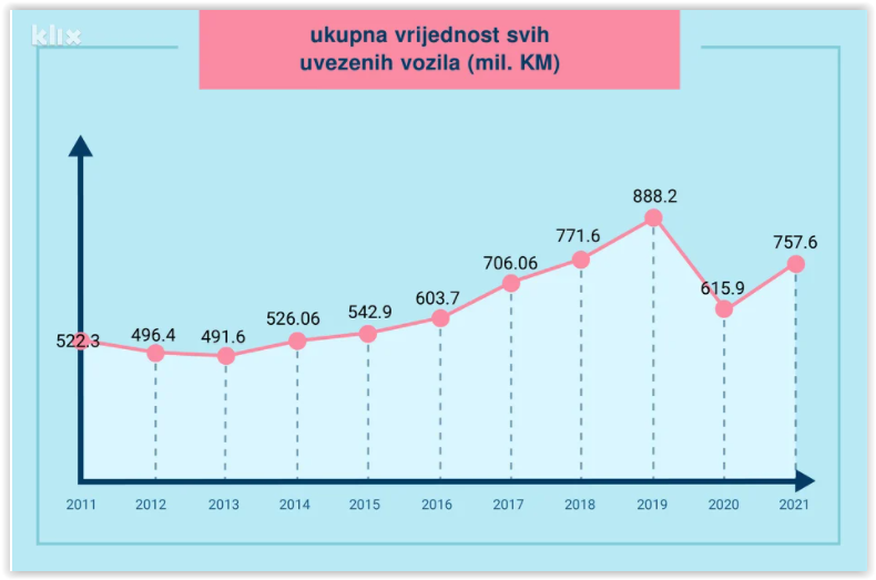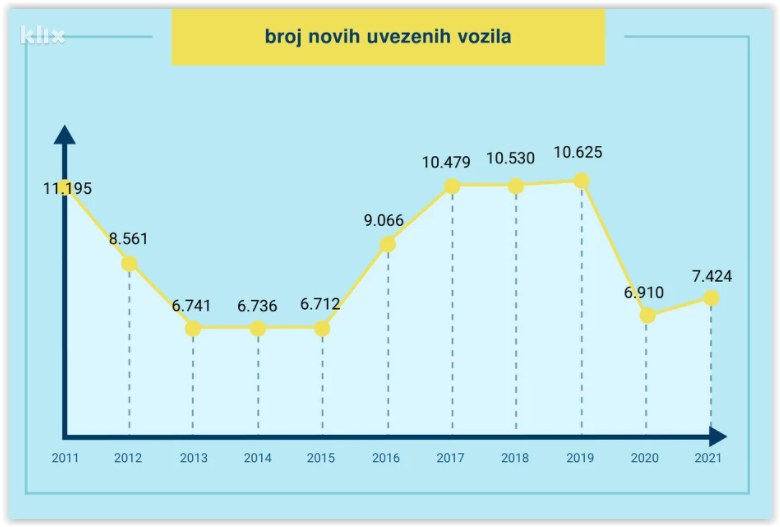 Najmanji broj vozila, ako posmatramo period od 2011. do 2021. uvezen je u 2011. godini, kada je uvezeno 47.051, a njihova vrijednost bila je preko 105,7 miliona KM. Međutim, vrijednost uvezenih vozila u ovoj godini ipak je veća od vrijednosti vozila koja su uvezena 2013. godine. Vrijednost uvezenih 58.408 vozila u 2013. godini bila je preko 87,1 milion KM.