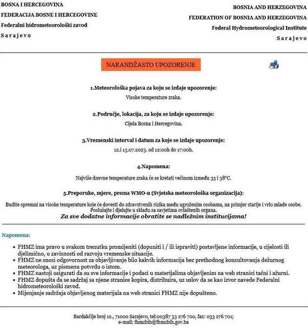“Zbog očekivanih ekstremno visokih temperatura zraka Federalni hidrometeorološki zavod izdaje narandžasto upozorenje za cijeli prostor Bosne i Hercegovine za 12. i 13. juli u periodu od 12:00 do 17:00 sati. Najviše dnevne temperature zraka kretat će se između 33 i 38 stepeni Celzijusa”, upozoravanju meteorolozi.