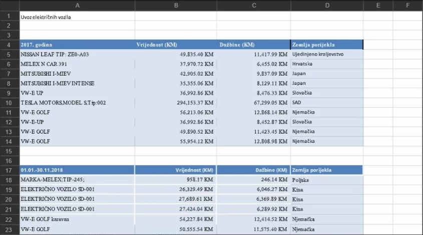 Osim toga, u BiH su uvezena tri električna vozila SD-001 kineskog porijekla, u vrijednosti od po blizu 27 hiljada KM i jedno Melex Tip-245 poljskog porijekla, u vrijednosti 958 KM.