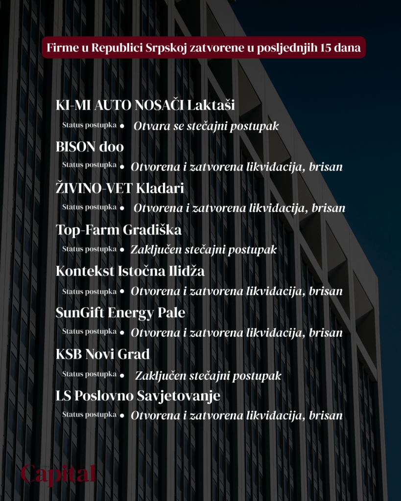 Zatvoreno je pet firmi iz Republike Srpske. Stečajni postupak zatvoren je u firmama “Agro centar” Gradiška i “Elite” Bijeljina, a likvidacioni postupak je zaključen u “Galaxy” Banjaluka, “Mibral” iz Istočnog Sarajeva i “Tehno-bravar” iz Gradiške.