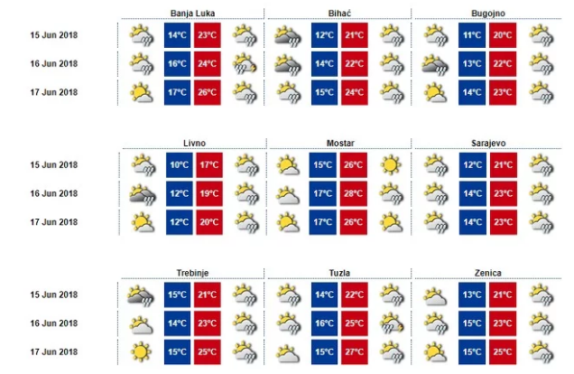 Danas je u Bosni bilo oblačno vrijeme, a u Hercegevini sunčano uz malu do umjerenu oblačnost. Do kraja dana ili u večernjim satima meteorolozi najavljuju kišu i pljuskove ponegdje praćene grmljavinom.