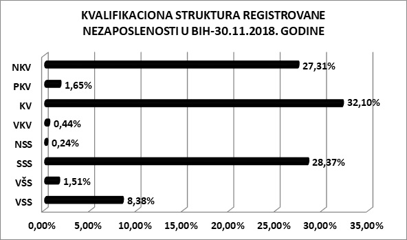 Najveći broj evidentirane nezaposlenosti čine osobe sa trećim stepenom obrazovanja KV radnici 32,10%, te radnici sa SSS 28,37%.