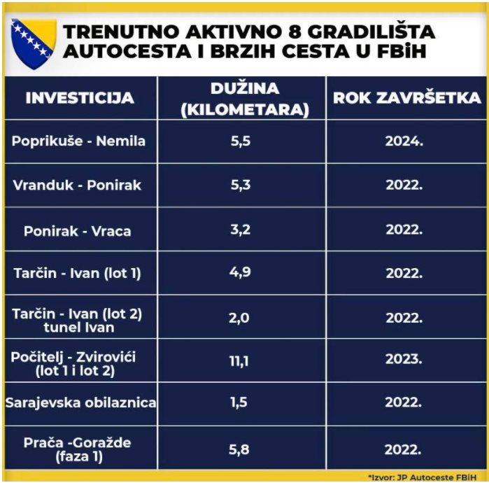 Prema podacima preduzeća „Autoceste FBiH“, trenutno je aktivno osam gradilišta puteva u FBiH.