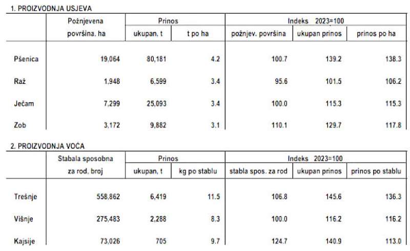 Povećanje proizvodnje u 2024. godini u poređenju sa prethodnom godinom se bilježi i kod ranog voća i to: kod trešanja za 36,3 posto, višanja za 16,2 posto i kajsija za 40,9 posto, podaci su Federalnog zavoda za statistiku.