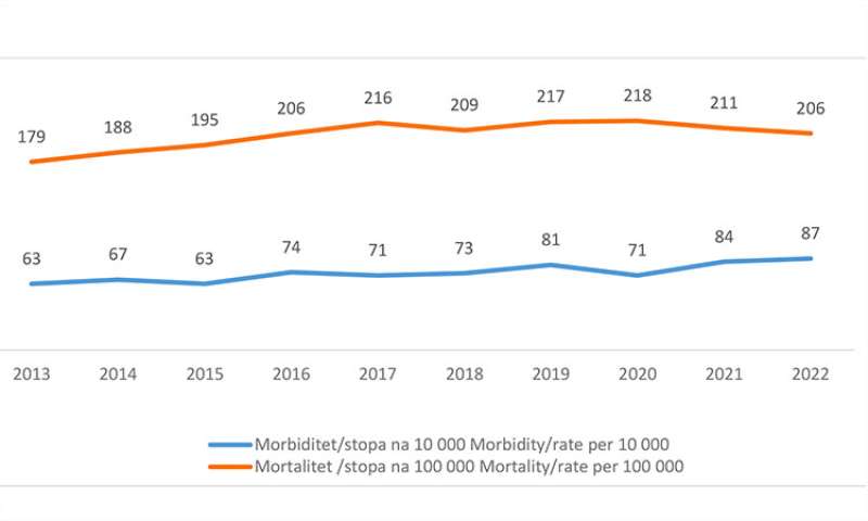 Stopa umiranja (mortaliteta) od malignih neoplazmi u 2022. godini iznosila je 206 na 100.000 stanovnika, a 2013., odnosno 2014. godine 73, odnosno 188. Nešto veća stopa umrlih bila je 2020. za vrijeme pandemije covida -19 i iznosila je 218.