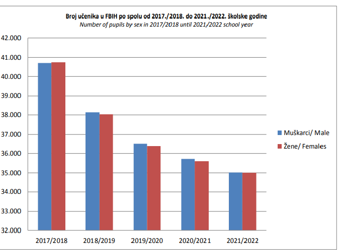 Federalni zavod za statistiku objavio je statistički bilten za srednje obrazovanje u kojem su objavljeni podaci upisanih učenika u srednjim školama u posljednjih pet godina i utvrđeno je da je broj srednjoškolaca u Federaciji Bosne i Hercegovine za pet godina smanjen za 11 hiljada učenika.