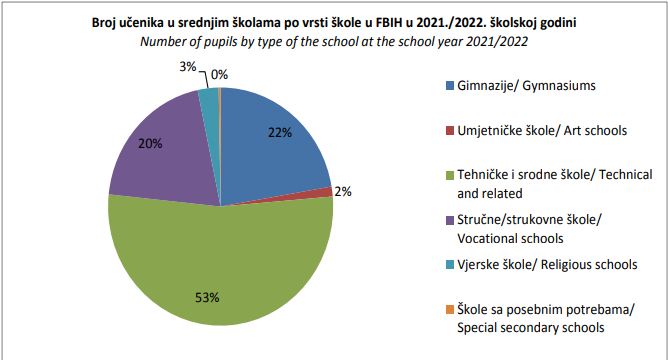 Prošle školske godine od 70.004 upisanih učenika, 15.617 (22 posto) je išlo u gimnazije, 37.112 (53 posto) u tehničke škole, 14.053 (20 posto) u stručne, 939 (2 posto) u umjetničke, 2.108 (3 posto) u vjerske škole i 195 (manje od jedan posto) u škole za učenike sa posebnim potrebama.