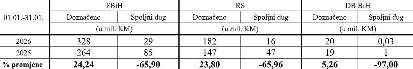 Uprava za indirektno oporezivane Bosne i Hercegovine (UIO BiH) je u januaru 2026. godine privredi vratila 187 miliona KM povrata PDV-a, pa su neto prihodi koji su otišli u raspodjelu korisnicima u januaru 2026. godine, a to su država, entiteti i Brčko distrikt, iznosili 698 miliona KM.