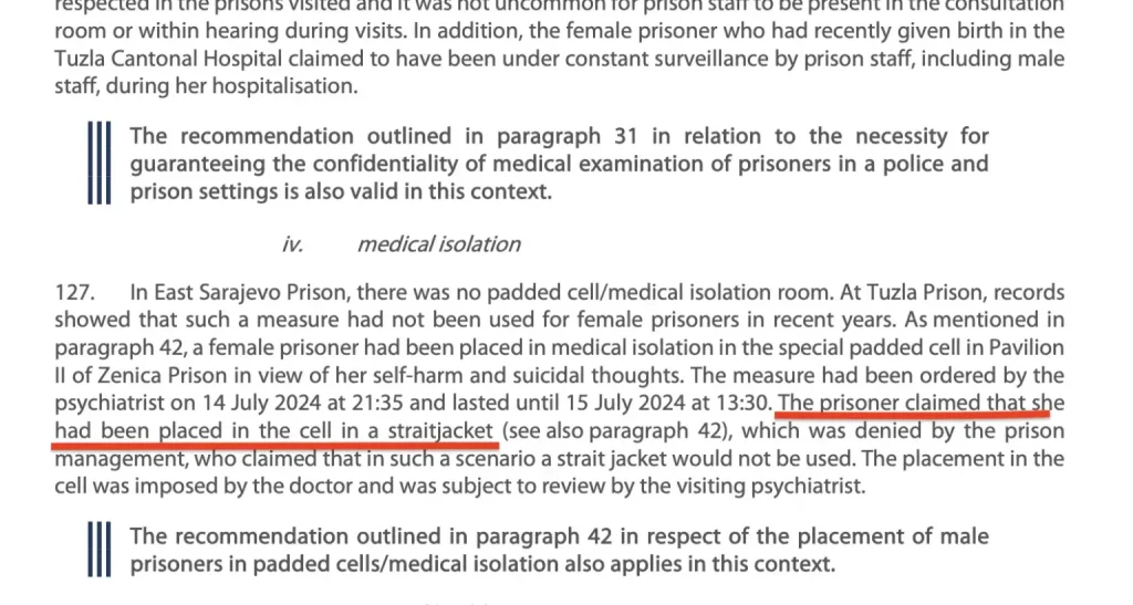 “Kao što je spomenuto u paragrafu 42, jedna zatvorenica je smještena u medicinsku izolaciju u posebnoj tapaciranoj ćeliji u Paviljonu II Zatvora u Zenici zbog njenog samopovređivanja i suicidalnih misli. Mjeru je naredio psihijatar 14. jula 2024. u 21:35 i trajala je do 15. jula 2024. u 13:30. Zatvorenica je tvrdila da je bila smještena u ćeliju u luđačkoj košulji, što je uprava zatvora negirala, tvrdeći da se u takvom scenariju luđačka košulja ne bi koristila”.