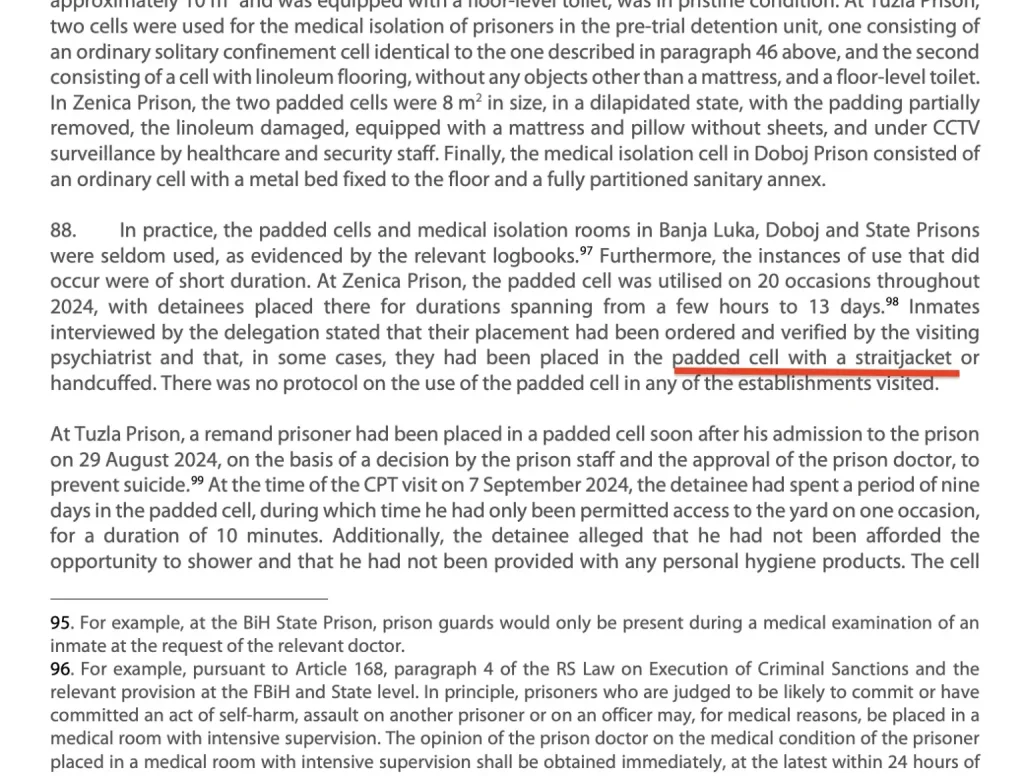 “Što se tiče modaliteta provedbe takve mjere, situacija uočena u Zatvoru u Zenici, gdje su zatvorenici mogli biti držani danima u tapaciranoj ćeliji s luđačkom košuljom, a na kraju pušteni kako bi mogli jesti ili obavljati fiziološke potrebe, svakako bi se mogla opisati kao nečovječno i ponižavajuće postupanje”.