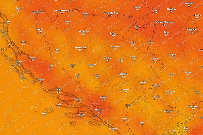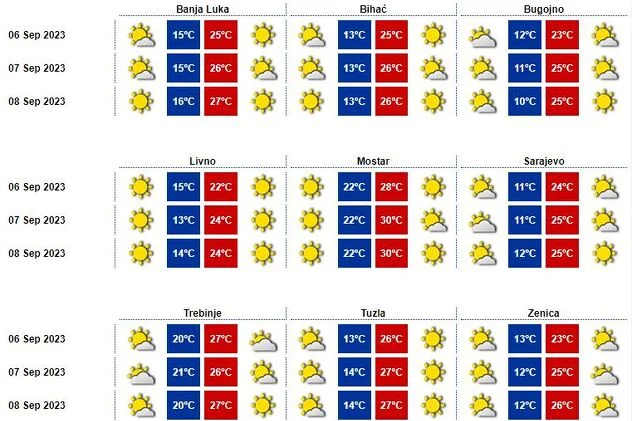 U periodu od 9. do 15. septembra vrijednosti temperatura zraka u jutarnjim satima kretat će se od 12 do 17 stepeni u Bosni, na jugu zemlje od 16 do 21, u najtoplijem dijelu dana maksimumi se očekuju do 33 u Bosni i 35 stepeni u Hercegovini.