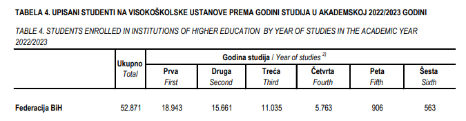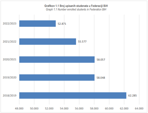 Da je riječ o kontinuirano lošem trendu ukazuju i podaci koje je ovaj zavod objavio za prethodne akademske godine pa je tako naprimjer u akademskoj 2019/2020. bilo upisano 58.048 studenata, što je mnogo više u odnosu na aktuelnu godinu, ali u odnosu na akademsku 2018/2019 ogroman pad jer je te akademske godine bilo upisano 62.285 studenata.