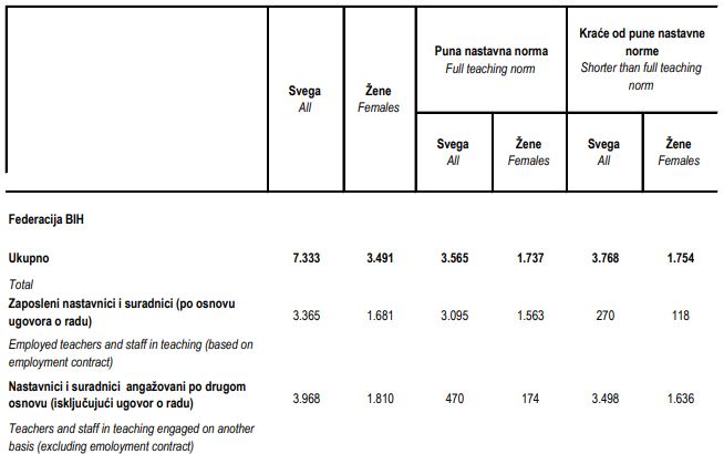Federalni zavod za statistiku također je objavio podatak da je ukupno 7.333 nastavnika i saradnika, uključujući i one koji imaju i one koji nemaju punu normu, u visokoškolskim ustanovama u Federaciji Bosne i Hercegovine. Također, podaci uključuju sve nastavnike i saradnike u nastavi koji predaju na visokoškolskim ustanovama i koji ne predstavljaju fizički broj osoba jer nastavnik i suradnik u nastavi može predavati na dva ili više fakulteta.
