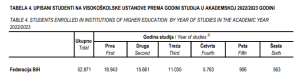 U zimskom semestru akademske 2022/2023. godine na visokoškolske ustanove upisano je ukupno 52.871 student, što je za 4,9 posto, odnosno za 2.706 studenata manje u odnosu na prethodnu akademsku godinu.