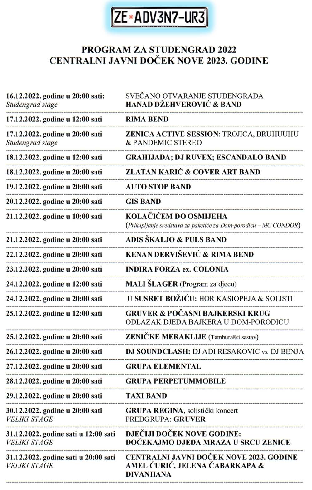 Pored već pomenutog vrhunskog programa za novogodišnju noć, organizator Gradska uprava sa svojim Javnim preduzećem RTV ZENICA, pripremila je bogat i raznovrstan program u samom „Studengradu“, u kojem će uživati Zeničani svih generacija. Ocjena javnosti da je ovogodišnji line-up izvođača najbolji do sada, uz učešće domaćih i regionalnih muzičkih zvijezda. U programu ZEnica Adventure-a, između ostalih, učestvuju Rima band, grupe Trojica, Bruhuuhu & Pandemic stereo, Zlatan Karić & Cover art band, Auto stop, Gis band, Adis Škaljo, Kenan Dervišević, sjajni Elemental, Indira Forza (ex Colonia) , zatim Perpetummobile, domaći DJ-vi Ruvex, Benja, Adi Resakovic, Escandalo bend, Taxi bend, Zeničke meraklije, hor Kasiopeja…