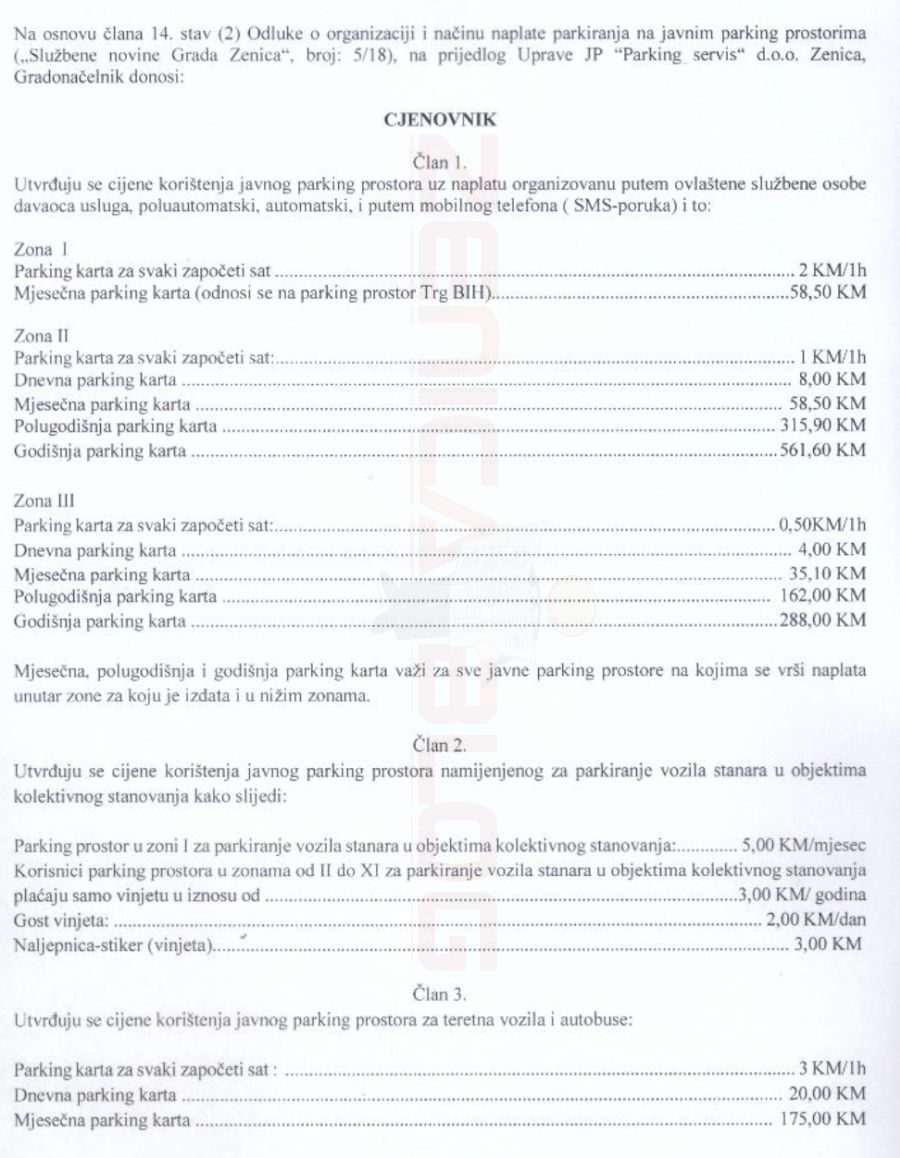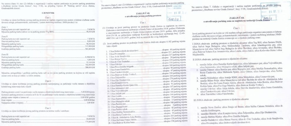 U skladu sa svojim ovlaštenjima Gradonačelnik Grada Zenica je donio Zaključak o utvrđivanju javnog parking prostora, Zaključak o utvrđivanju parking zona uz naplatu na teritoriji Grada Zenice i Cjenovnik usluga.