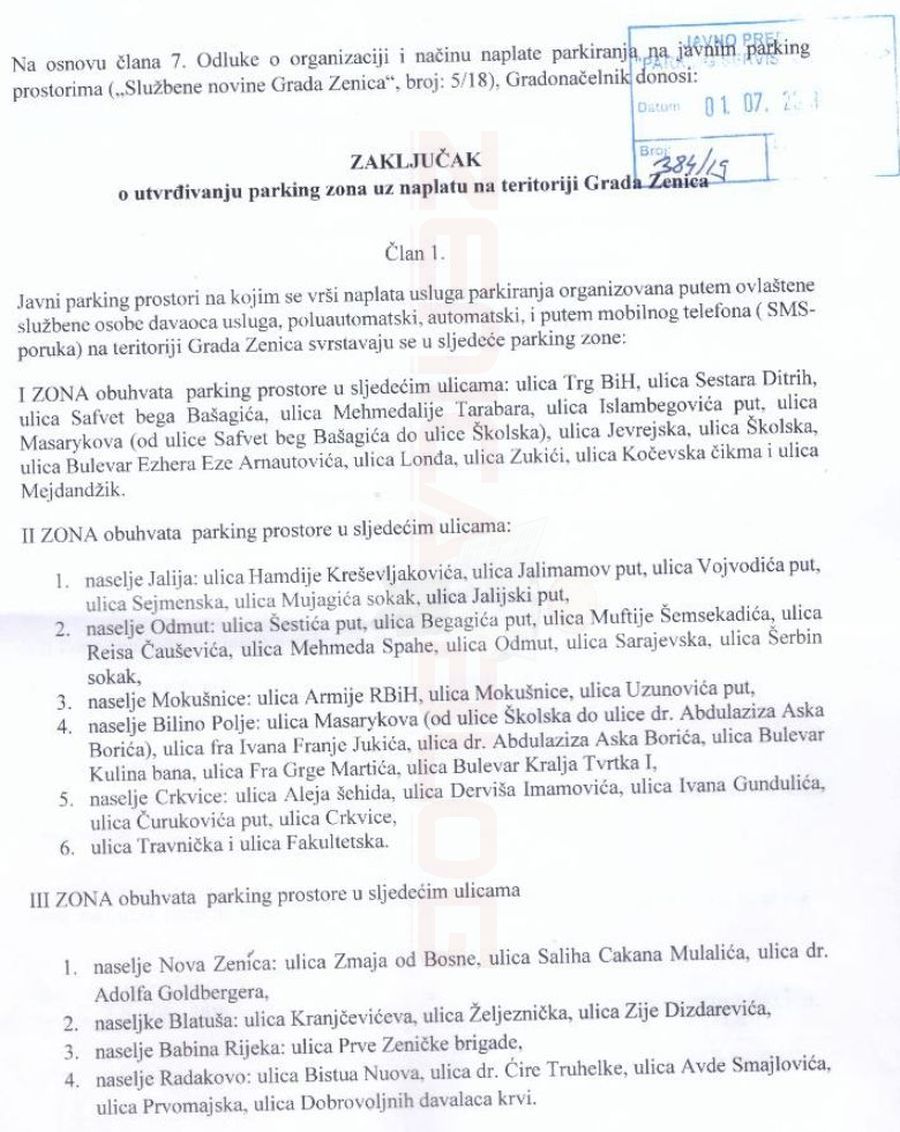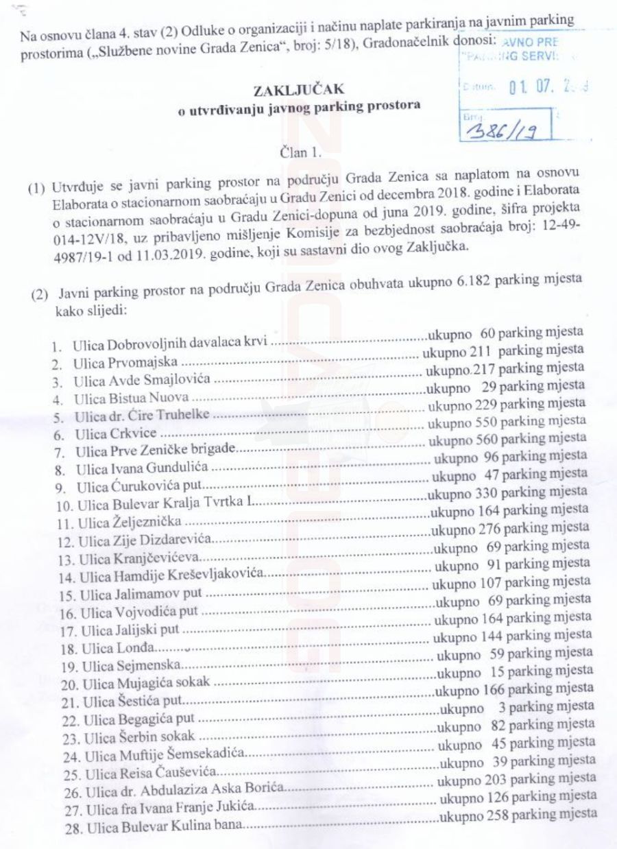 Na vanrednoj sjednici Nadzornog odbora koja je održana dana 24.07.2019. godine, u 1830 sati, Nadzorni odbor je donio odluku da će primjena Odluke o organizaciji i načinu naplate parkiranja na javnim parking prostorima („Službene novine Grada Zenica“, broj: 5/18) početi od 01.08.2019. godine, jer su osigurane sve pravne i materijalno-tehničke pretpostavke za primjenu Odluke.