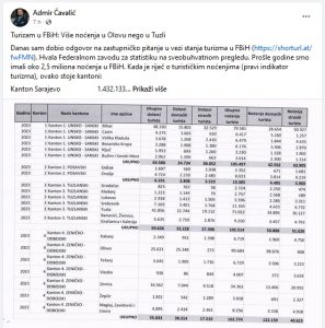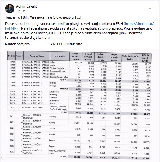 Tako Olovo (99.684) ima veći broj evidentiranih turističkih noćenja od Zenice (34.361), Tuzle (71.022), ali i Bihaća (79.581). Ilidža svakako dominira sa 605.544 noćenja – više od Hercegovačko-neretvanskog kantona. Ova statistika je i više nego potrebna jer je bitno na pravi način razumjeti tokove (federalnog, u ovom slučaju) turizma – kako bi se vršila strateška planiranja, ali svakako i razbijali mitovi o tome da je svako mjesto apriorno turističko – naveo je Čavalić na društvenim mrežama.
