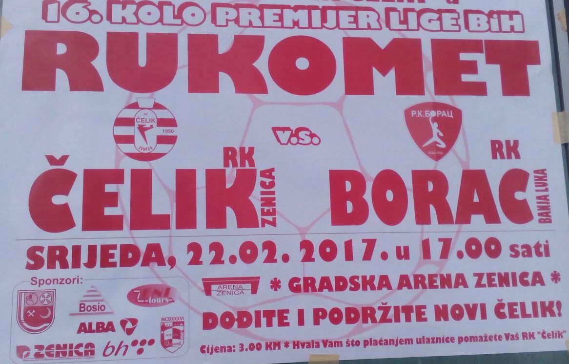 Da ponovimo, utakmica između Čelika i Borca igra se u srijedu 22.02.2017.godine u Areni Zenica sa početkom u 17 sati. Ulaz je 3 KM.